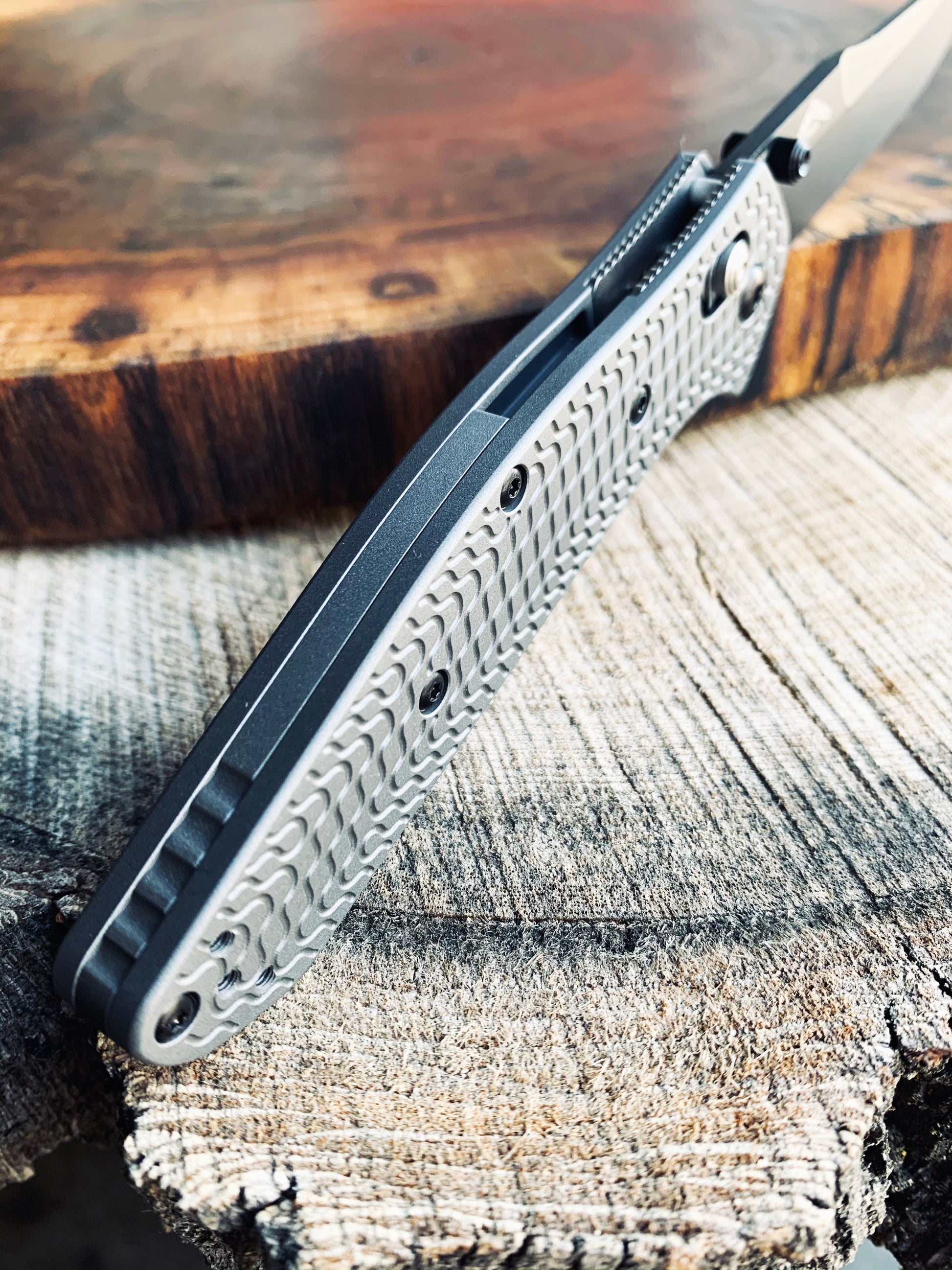 This lightweight TI handle provides better rigidity compared to the stock handle. Due to the aggressive pocketing, the knife weighs around 3oz providing a good balance between weight and strength.