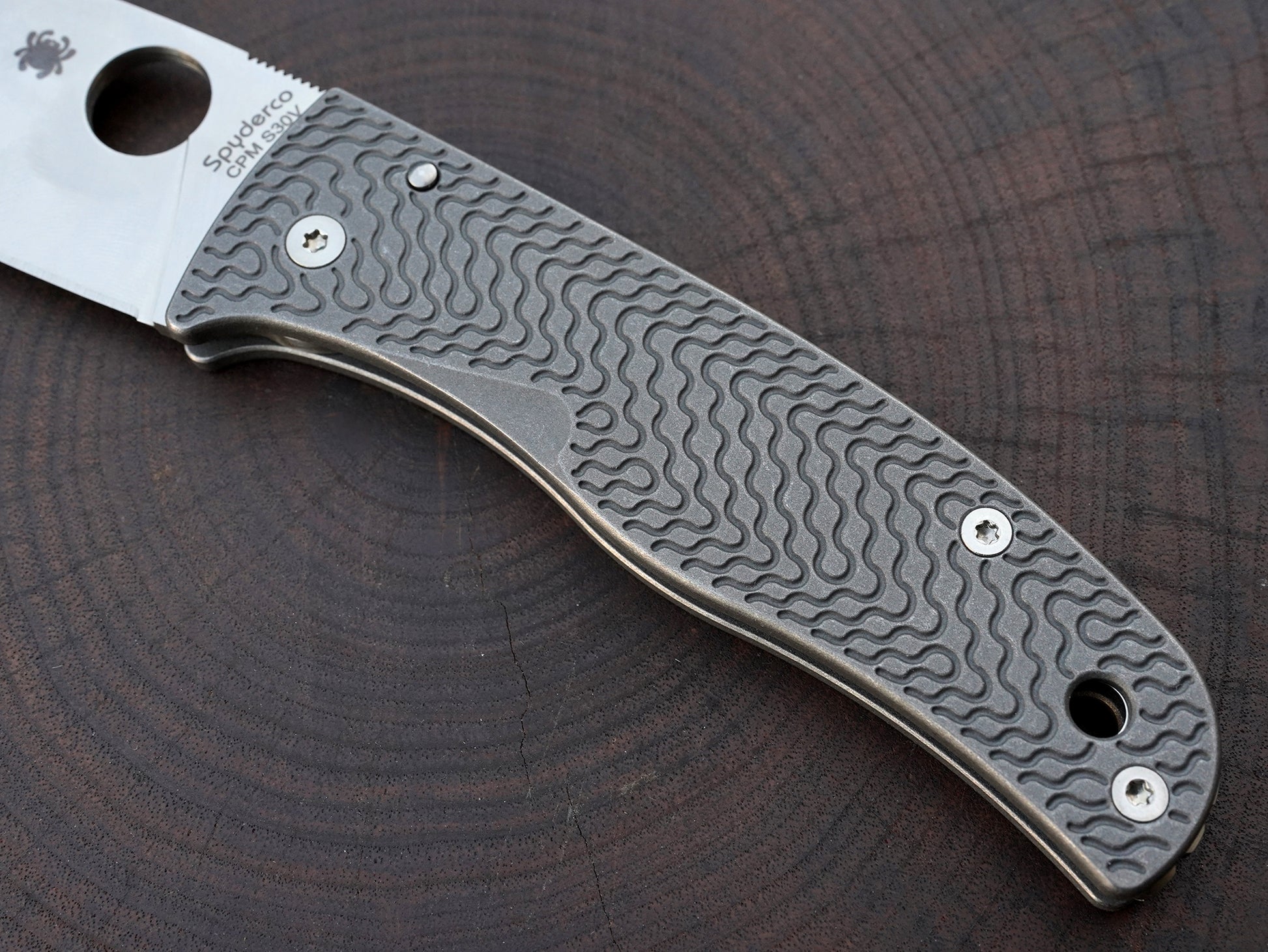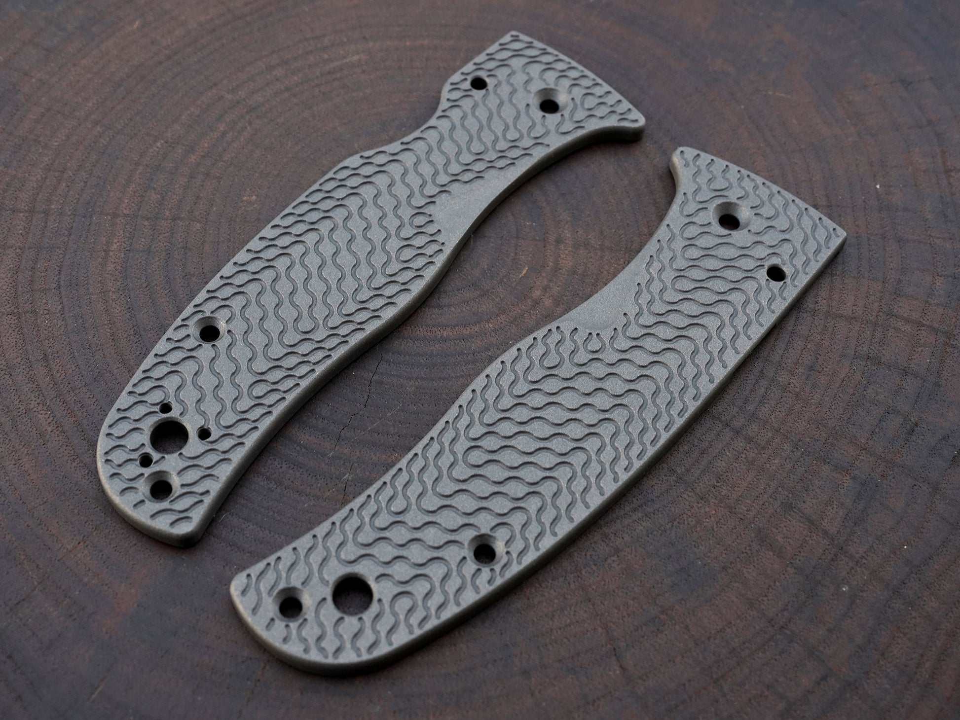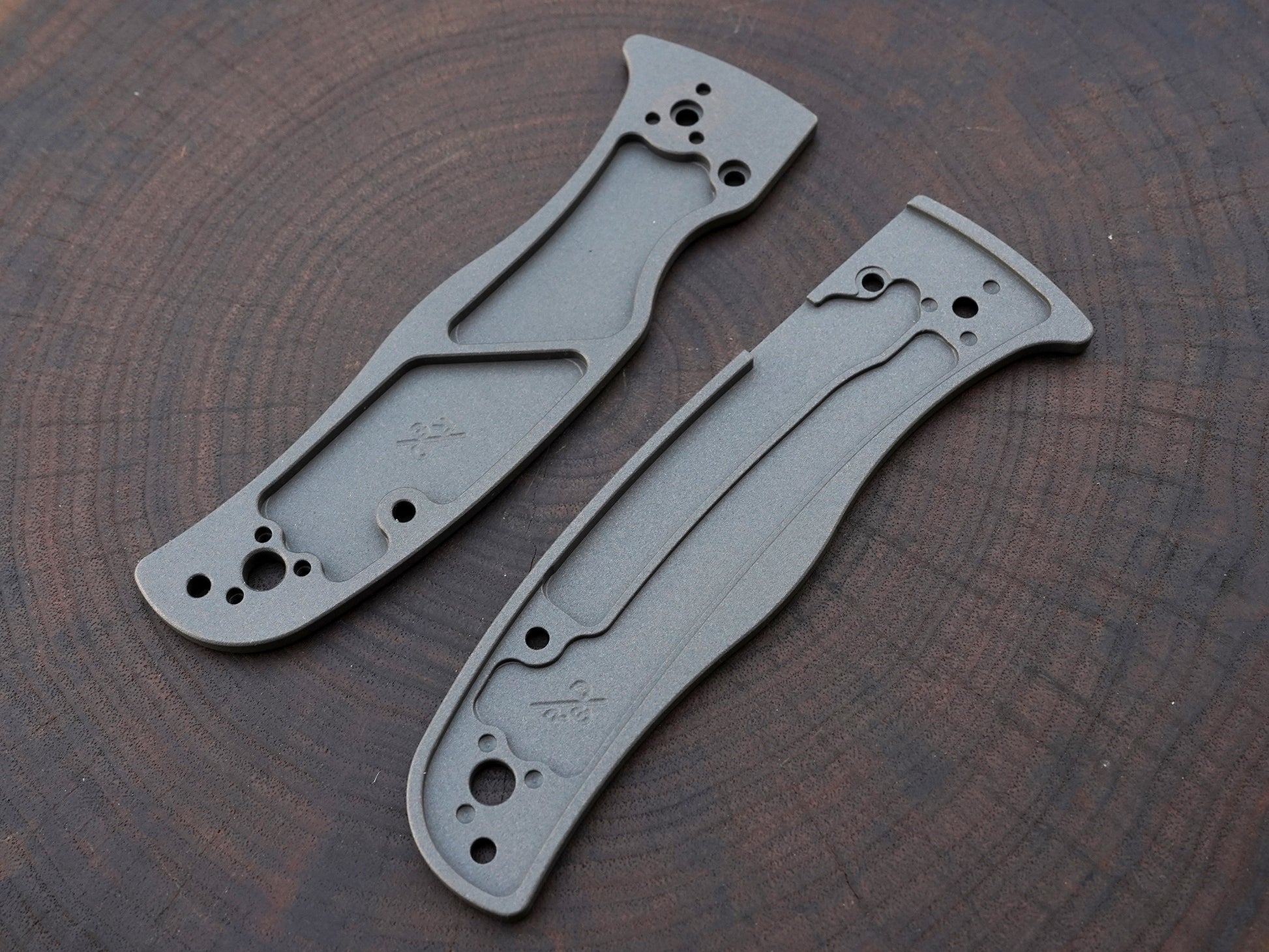 Made out of grade 5 titanium. The handle offers an excellent combination of high strength and toughness over the stock G10. The scales are machined with attention to detail with hard edges chamfered and hand-sanded for a smooth finish before blasting.