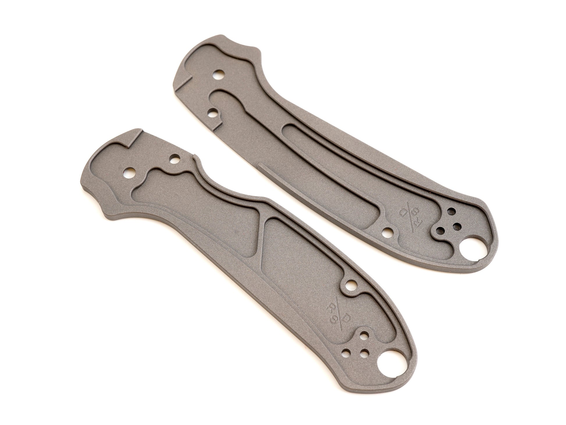 Made out of grade 5 titanium. The handle offers an excellent combination of high strength and toughness over the stock G10. These scales are machined with lots of attention to details with hard edges chamfered and hand sanded for a smooth finish before blasting for better traction. The scales weigh about 2.1oz and about 4.5oz with the knife.
