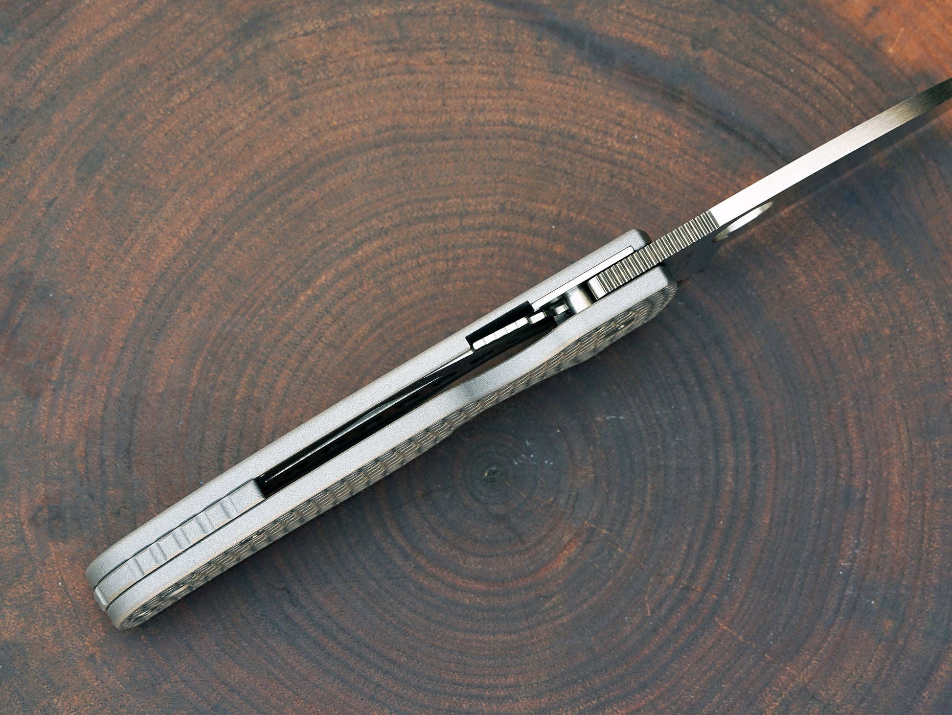 Made out of grade 5 titanium. The handle offers an excellent combination of high strength and toughness over the stock G10. The scales are machined with attention to details, hard edges chamfered and hand-sanded for a smooth finish before blasting. The scales weigh about 5oz with the knife.