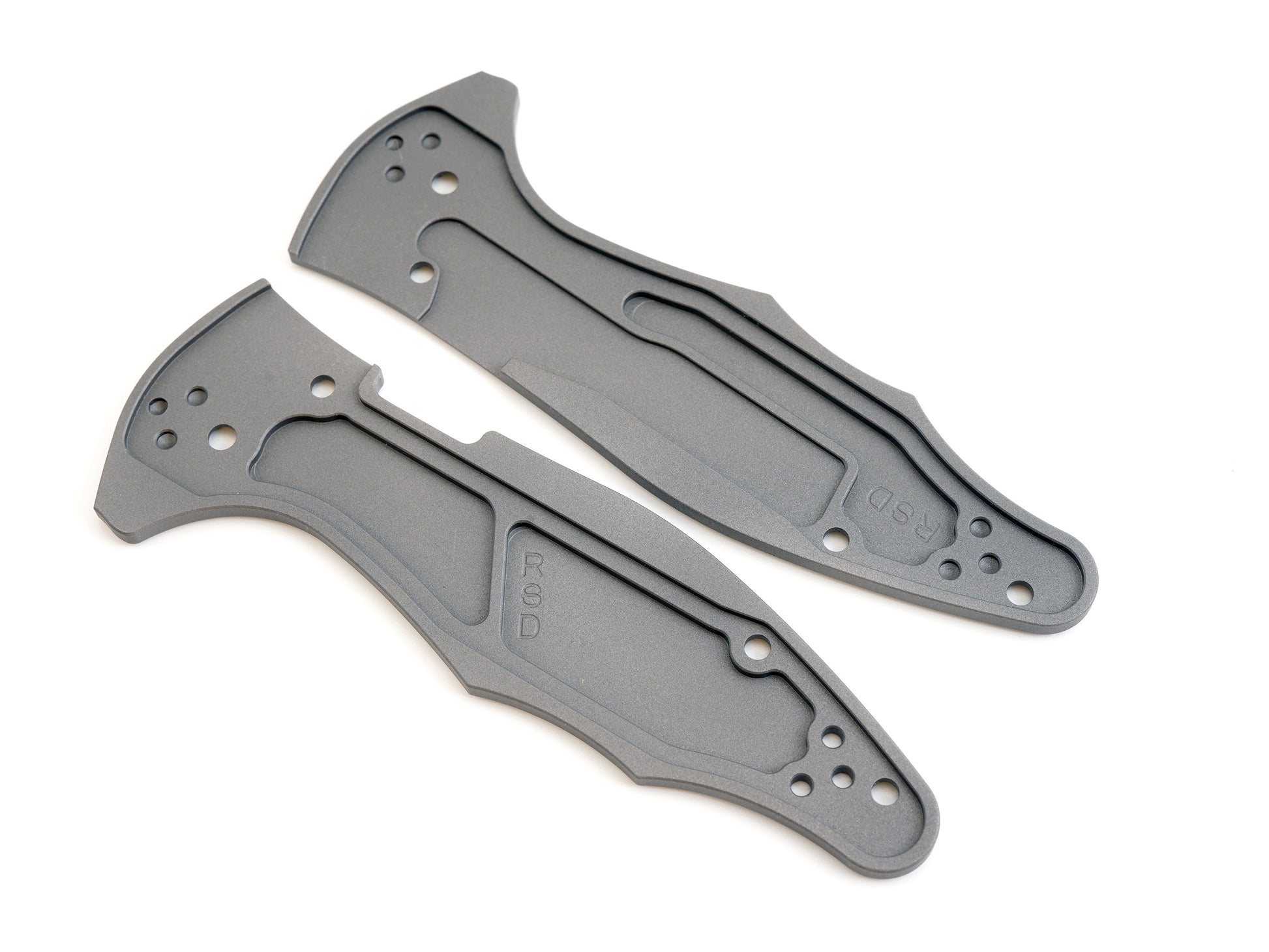 Made out of grade 5 titanium. The handle offers an excellent combination of high strength and toughness over the stock G10. The scales are machined with lots of attention to details with hard edges chamfered and hand sanded for a smooth finish before blasting. The scales weigh about 2.2oz and about 5.4oz with the knife.