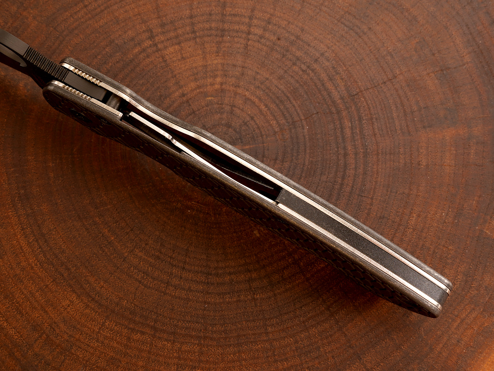 Machined grade 5 titanium, the handle combines exceptional strength and durability, surpassing that of standard G10. The scales are meticulously machined, with sharp edges chamfered and hand-sanded for a seamless finish. The dark wash features a black ceramic coating over media-blasted surfaces, followed by stone washing for a battle-worn appearance. The total weight of the knife with Ti scales is approximately 5.5 ounces.