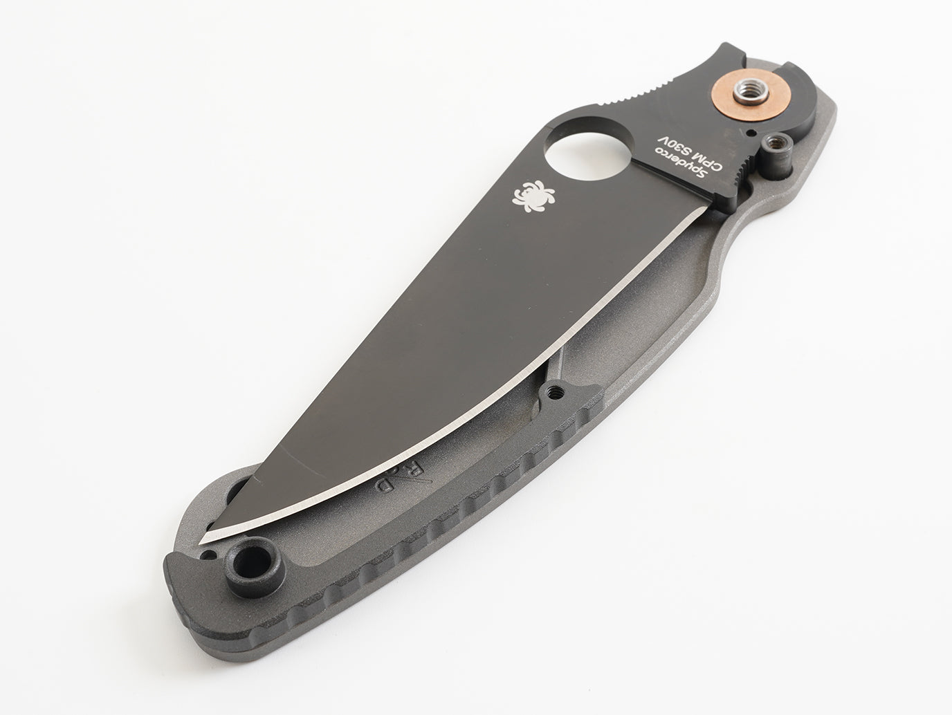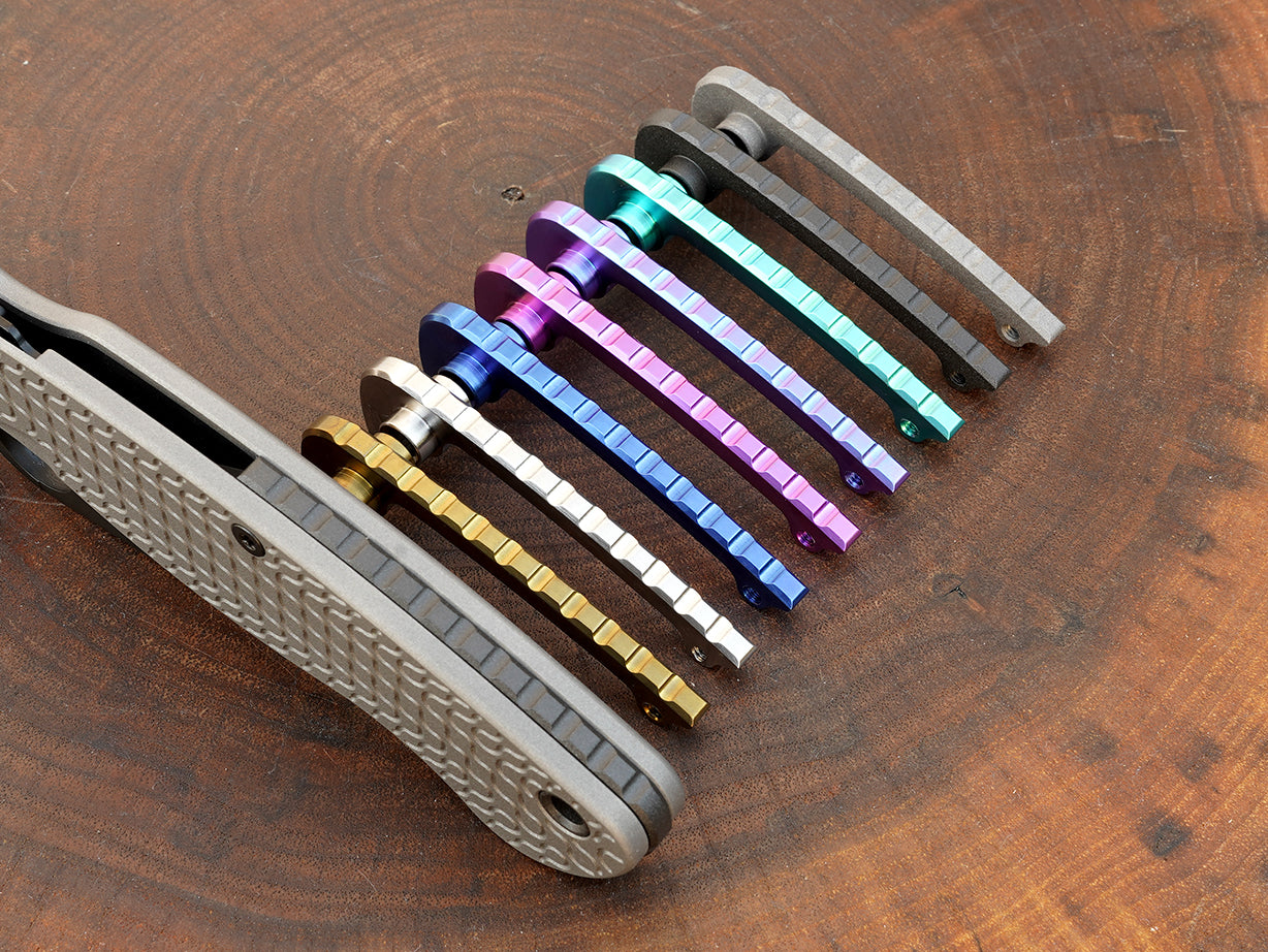 Titanium gear backspacer with integrated lanyard tube for Spyderco Military 2. The weight of the backspacer is about .25oz.
