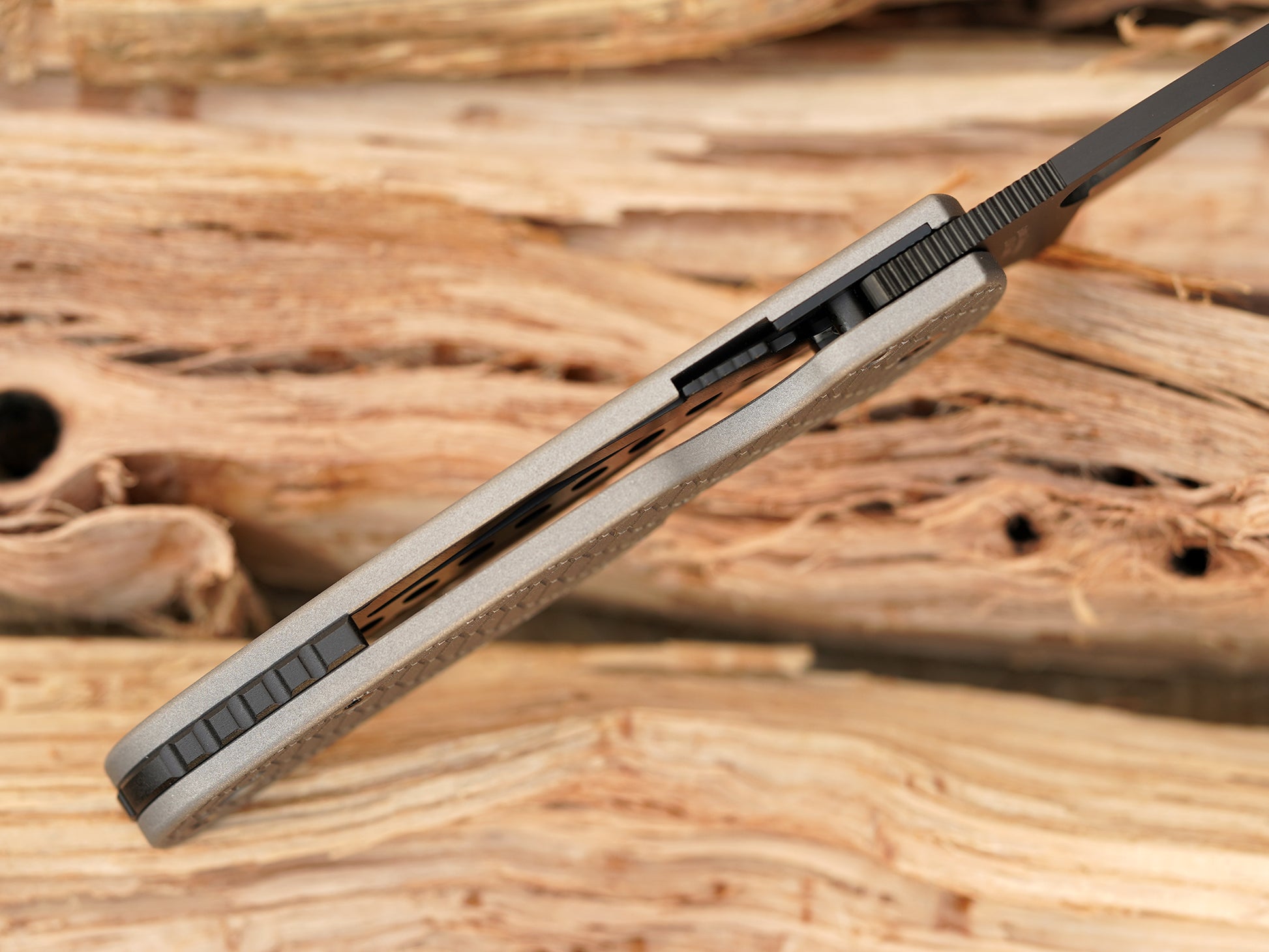 Made out of grade 5 titanium. The handle offers an excellent combination of high strength and toughness over the stock G10. The scales are machined with attention to details, hard edges chamfered and hand-sanded for a smooth finish before blasting. The scales weigh about 5oz with the knife.