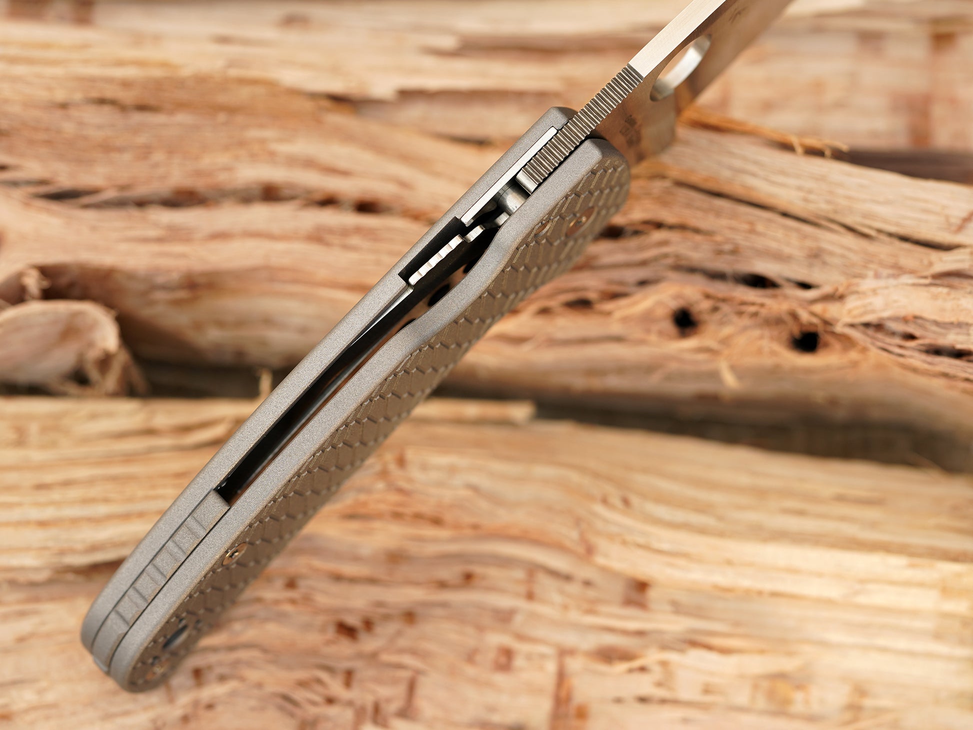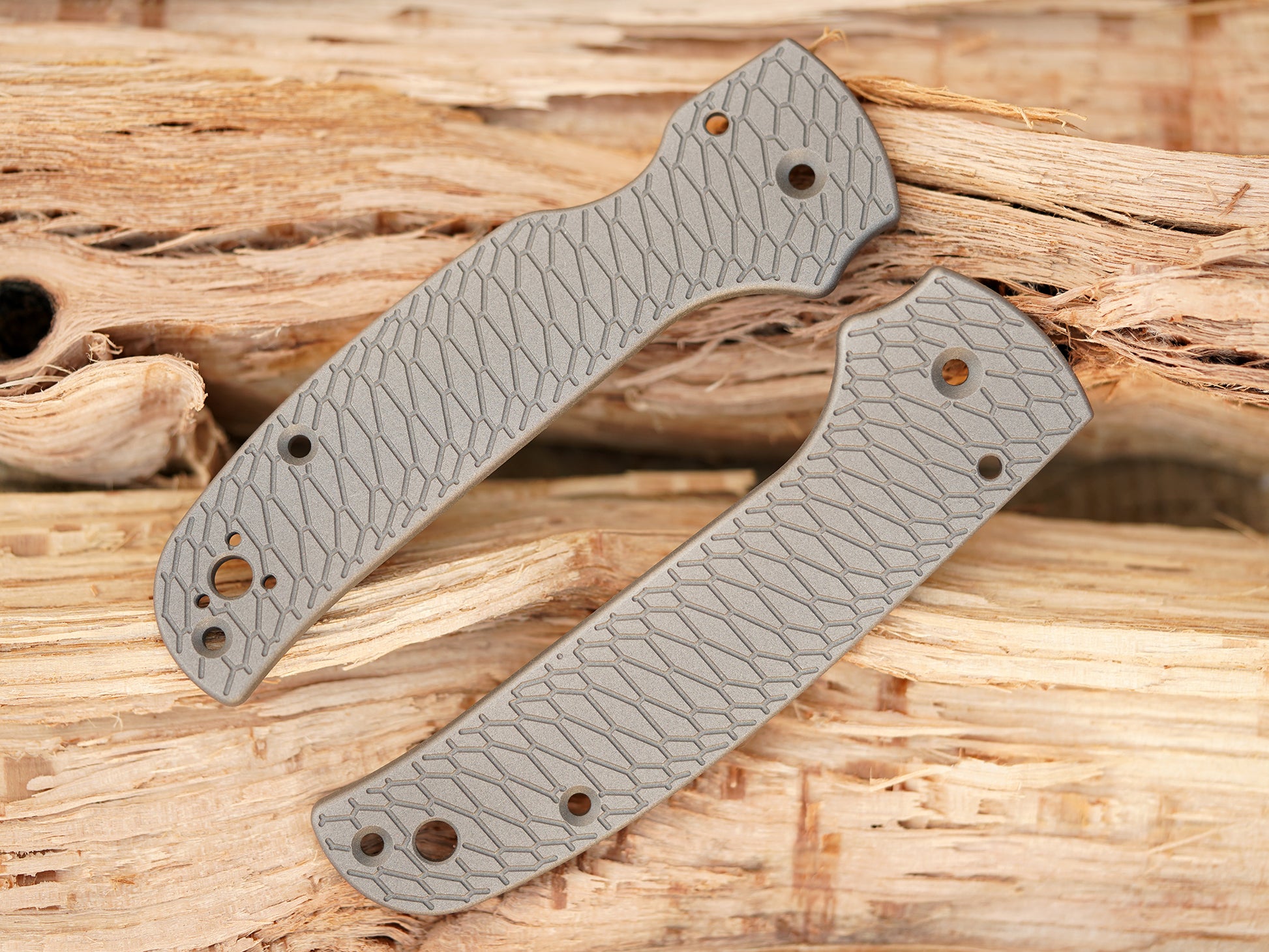 Made out of grade 5 titanium. The handle offers an excellent combination of high strength and toughness over the stock G10. The scales are machined with attention to details, hard edges chamfered and hand-sanded for a smooth finish before blasting. The scales weigh about 5oz with the knife.