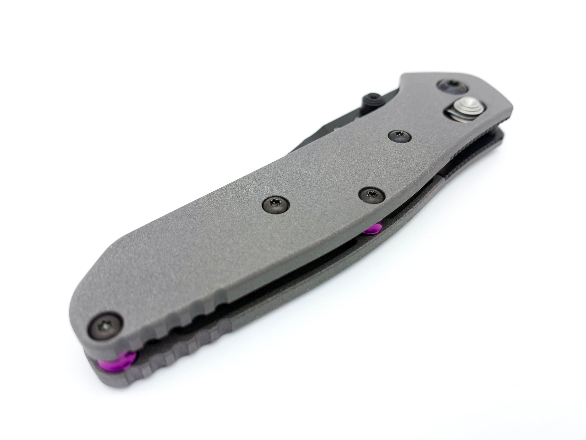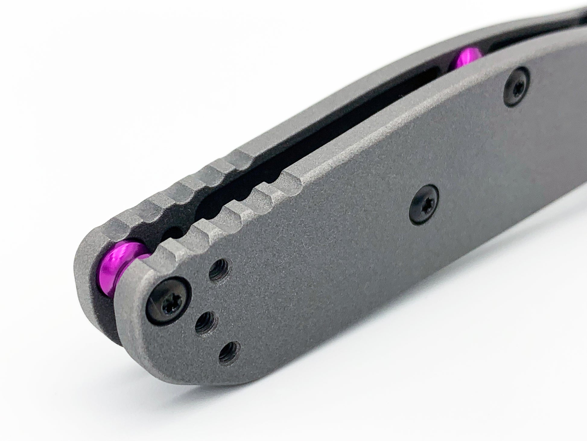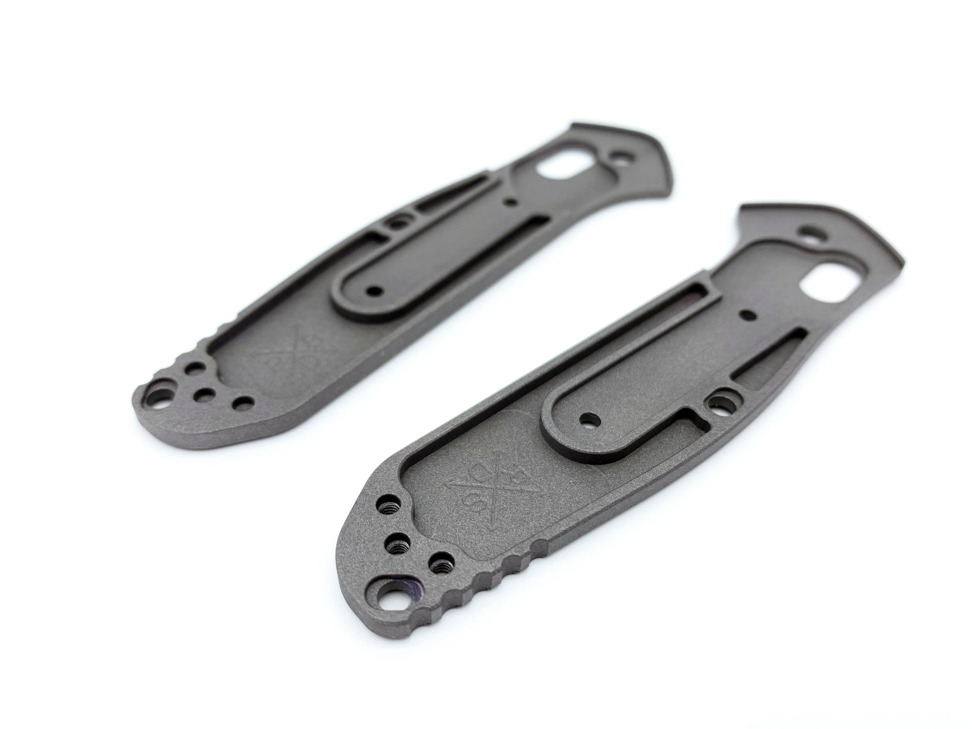This lightweight TI handle provides better rigidity compared to the stock handle. Due to the aggressive pocketing, the knife weighs about 2.4oz providing a good balance between weight and strength. This scale is blasted with aluminum oxide to provide better traction.