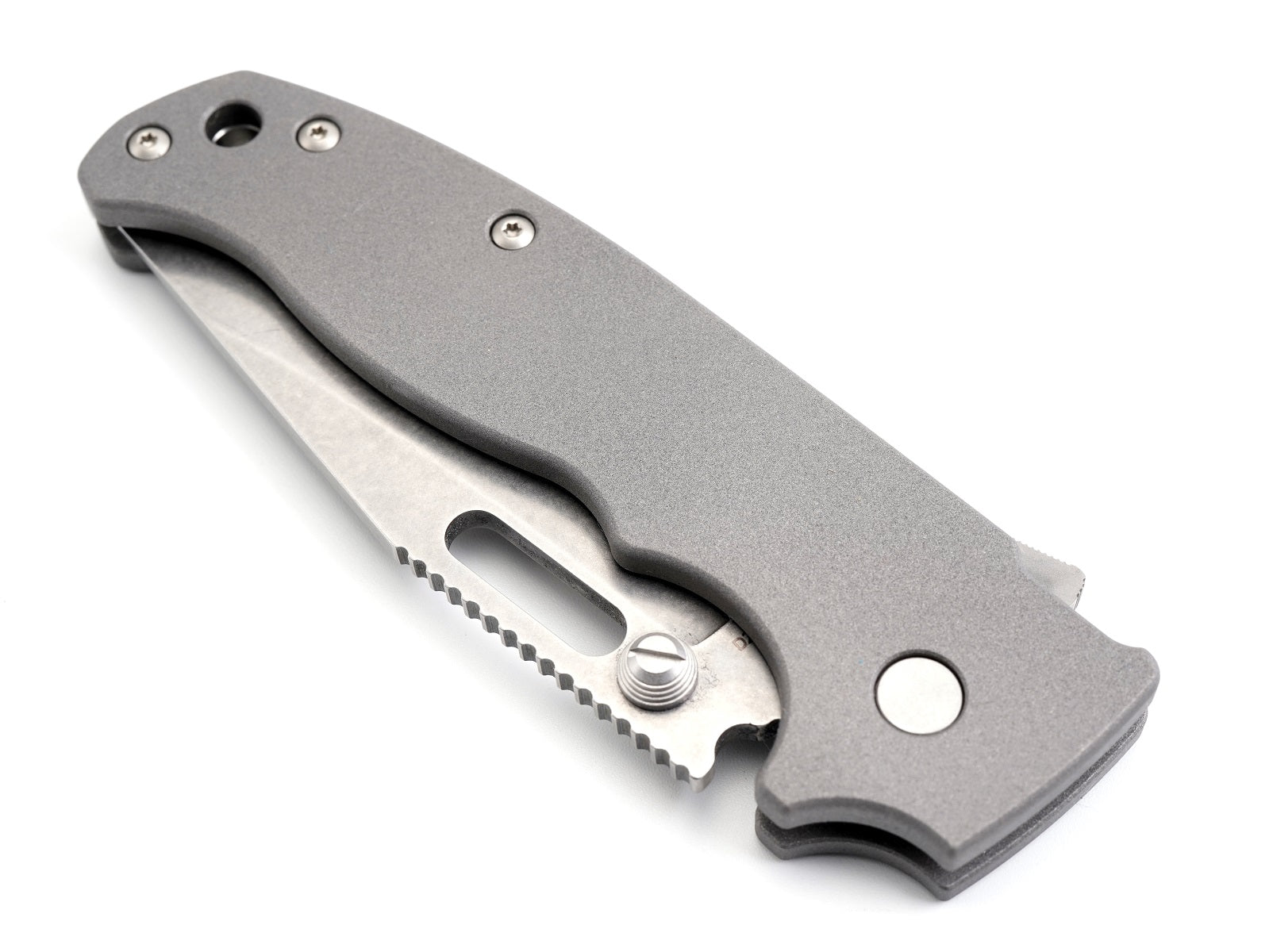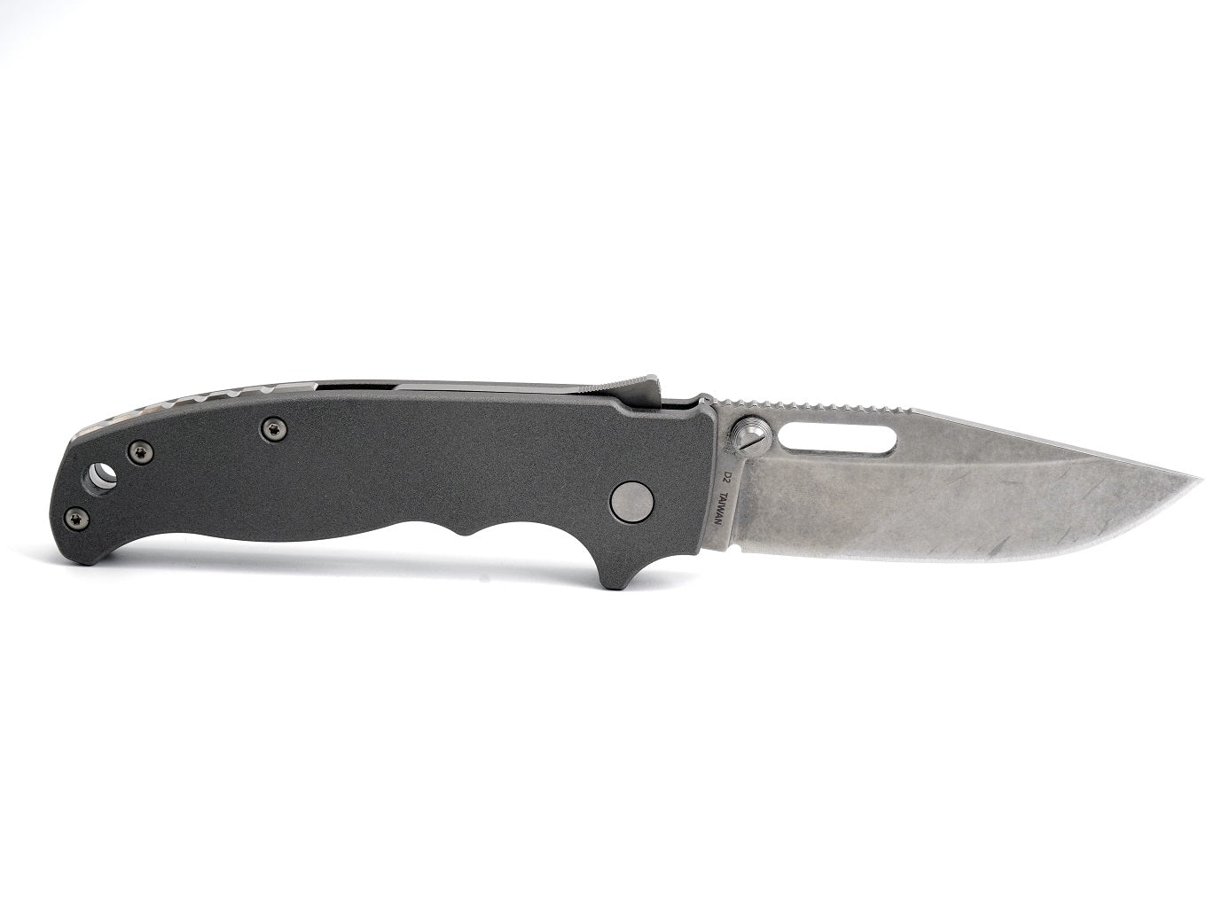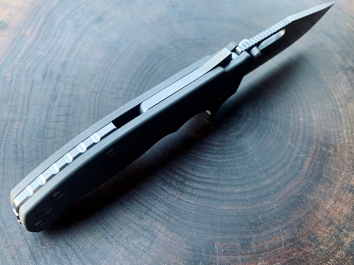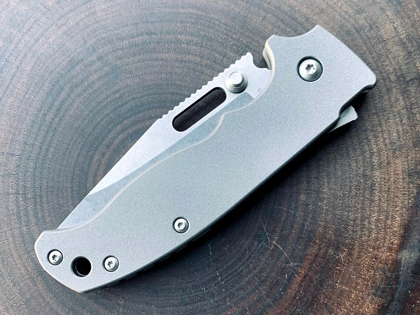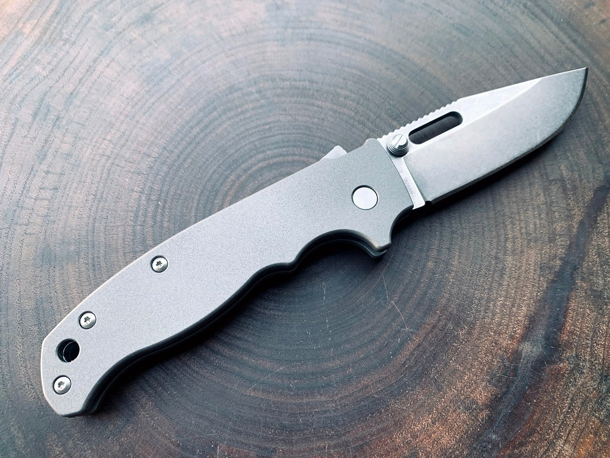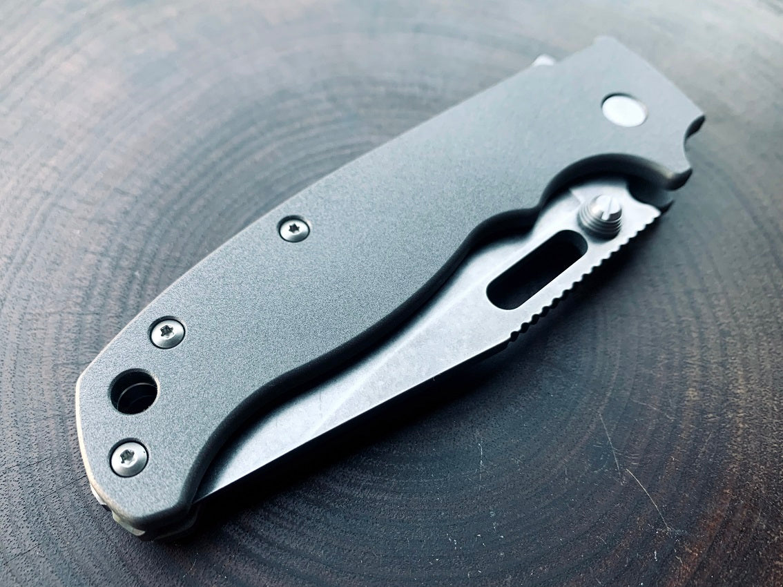The scales provide a thicker handle, larger forward finger choil, and a fully recessed lock grove. These adjustments are made for added comfort when handling, deploying and disengaging the shark lock. Due to the deep milling of the scales, the total weight of the knife is about 4.1oz.