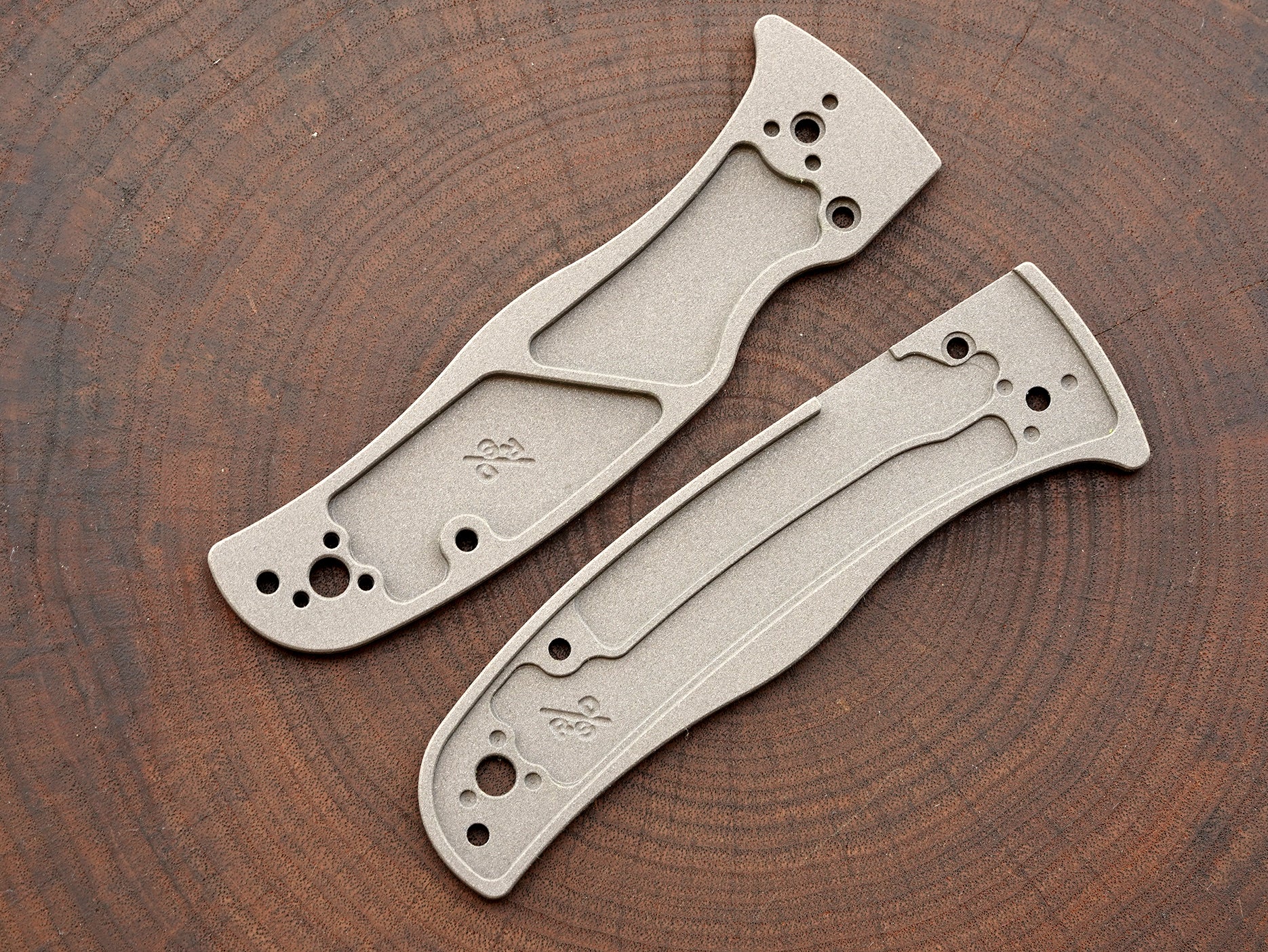 Made out of grade 5 titanium. The handle offers an excellent combination of high strength and toughness over the stock G10. The scales are machined with attention to detail with hard edges chamfered and hand-sanded for a smooth finish before blasting.
