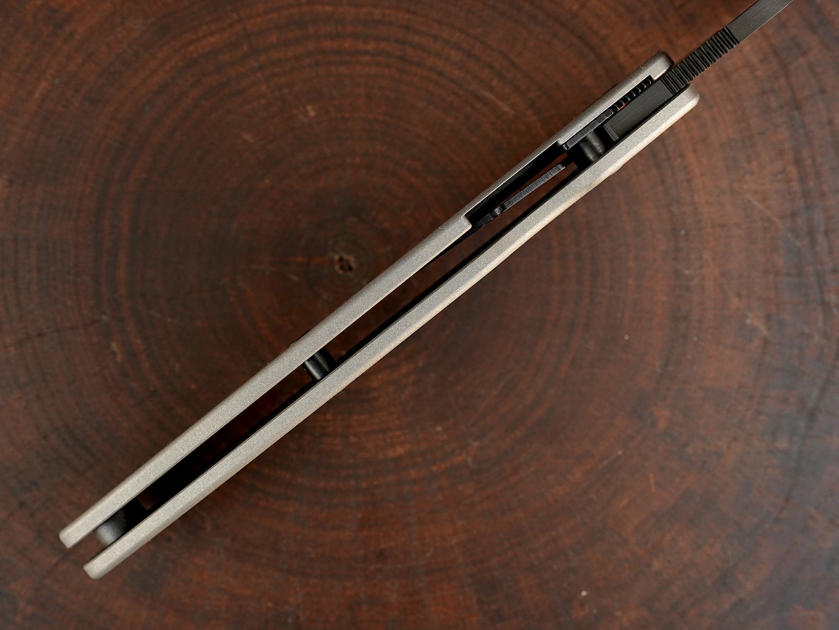 Machined grade 5 titanium, the handle combines exceptional strength and durability, surpassing that of standard G10. The scales are meticulously machined, with sharp edges chamfered and hand-sanded for a seamless finish. The total weight of the knife with Ti scales is approximately 5.5 ounces.